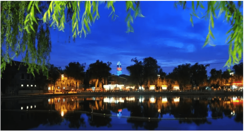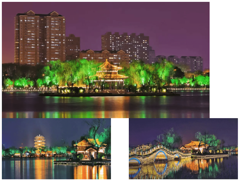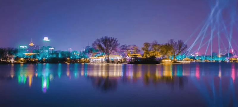 濟(jì)南百花洲畔,華燈初上時(shí)分,原本就有七分詩意的水榭垂柳更加朦朧。