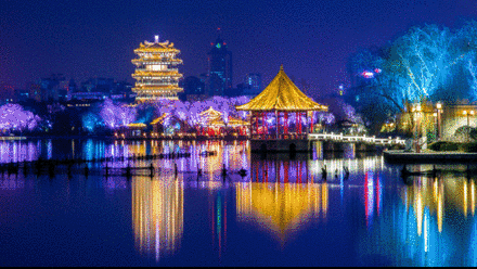 百花洲夜色 有一種夜叫“古建筑如夢如幻引人醉” 這一碧波粼粼的小湖,岸邊弱柳臨風(fēng),嬌柔婀娜。一條青石板路環(huán)繞著小湖,湖中蓮荷叢生,紅花朵朵,這便是百花洲。在月光的映襯下,更顯得美輪美奐。