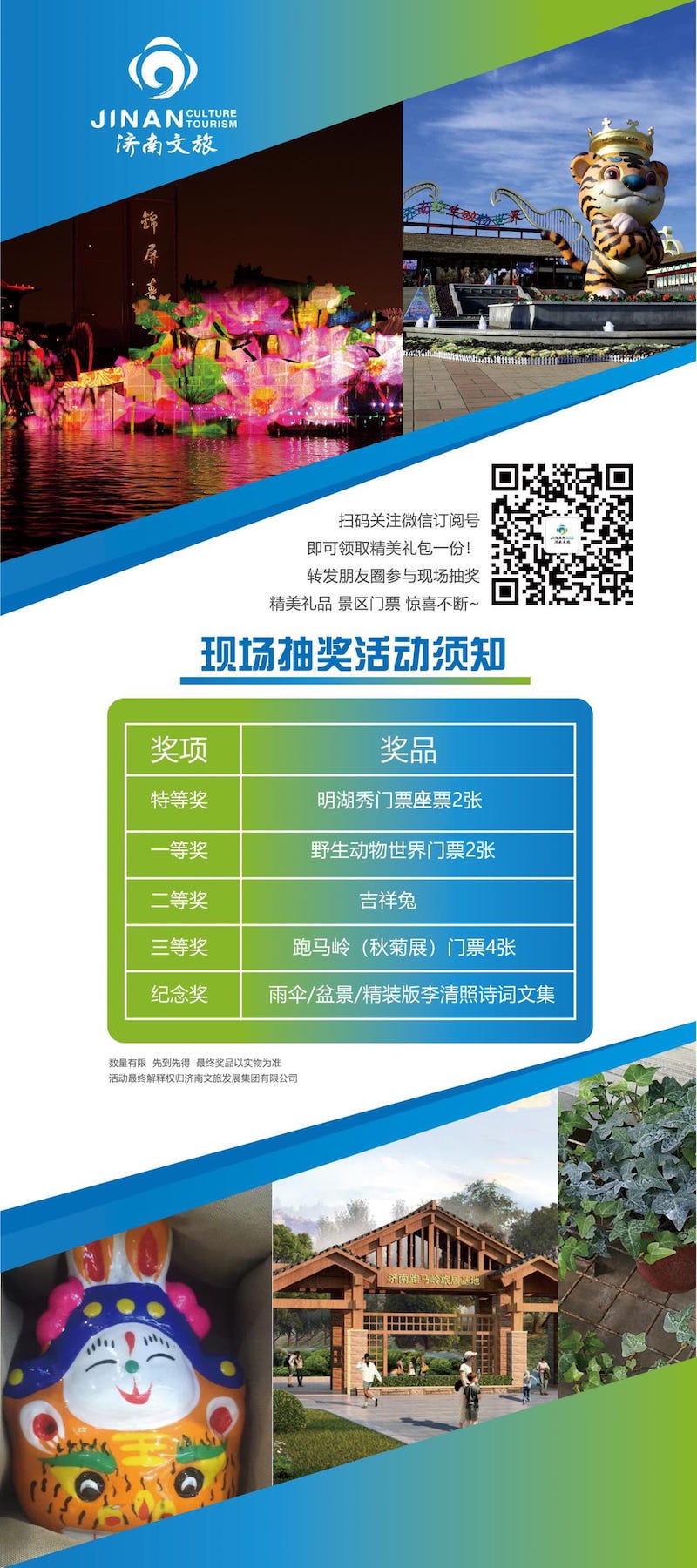 展會現(xiàn)場的抽獎活動最是誘人,通過掃描集團(tuán)訂閱號二維碼即可領(lǐng)取精美禮包一份,轉(zhuǎn)發(fā)朋友圈,參與現(xiàn)場抽獎活動,獎品有明湖秀觀演坐票、濟(jì)南野生動物世界門票、吉祥兔、跑馬嶺(秋菊展)門票、定制雨傘、盆景、精裝版李清照詩詞文集等,好禮多多,等您來!