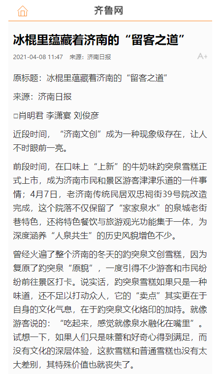 眼下,濟(jì)南正在營(yíng)造世界知名的泉水文化會(huì)客廳,無(wú)論一支冰棍,還是一所院子,只要有走心的文化創(chuàng)意,這些都可以成為城市客廳里賞心悅目的“土特產(chǎn)”,而如何對(duì)其充分開(kāi)掘利用,這里面其實(shí)蘊(yùn)藏著濟(jì)南的留客之道。