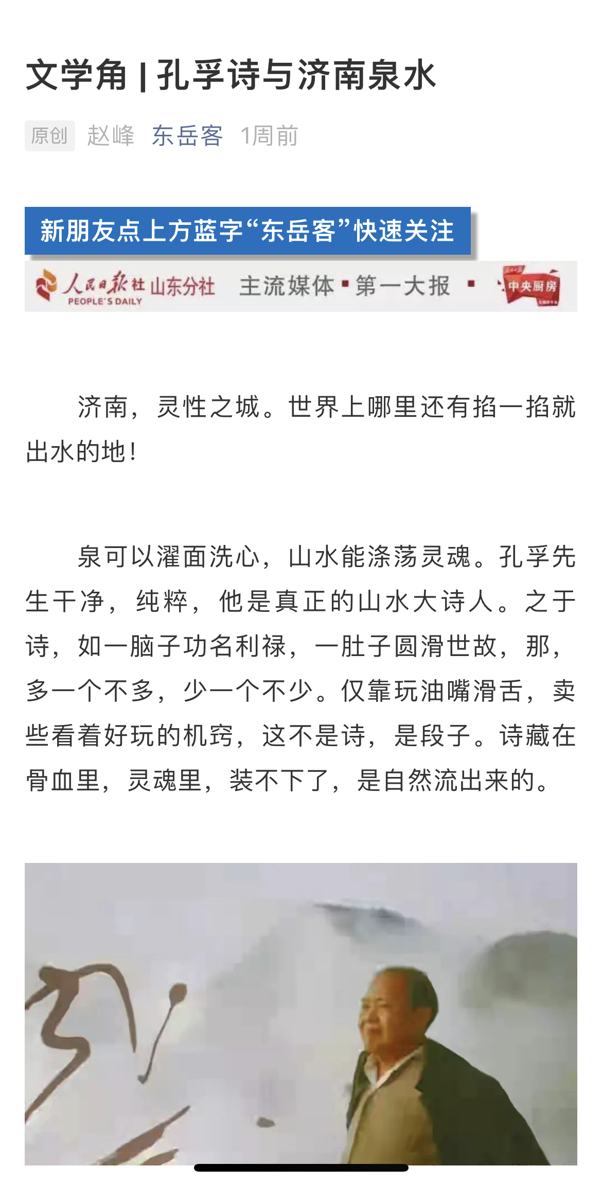2021年9月5日,“東岳客”以《孔孚詩與濟南泉水》為題,刊發(fā)趙峰關(guān)于濟南泉水的回憶和思考,如下為報道詳情——