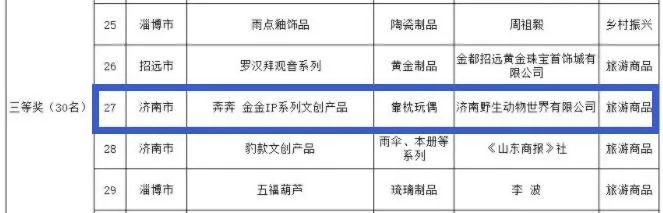 由濟(jì)南野生動(dòng)物世界報(bào)送的《奔奔 金金IP系列文創(chuàng)產(chǎn)品》榮獲篇2021第二屆山東省精品旅游文創(chuàng)設(shè)計(jì)大賽三等獎(jiǎng)。