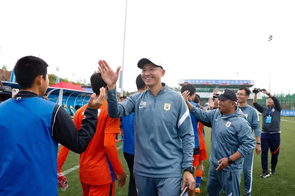 ↑山東泰山U15隊(duì)主教練周海濱賽后與隊(duì)員慶祝勝利