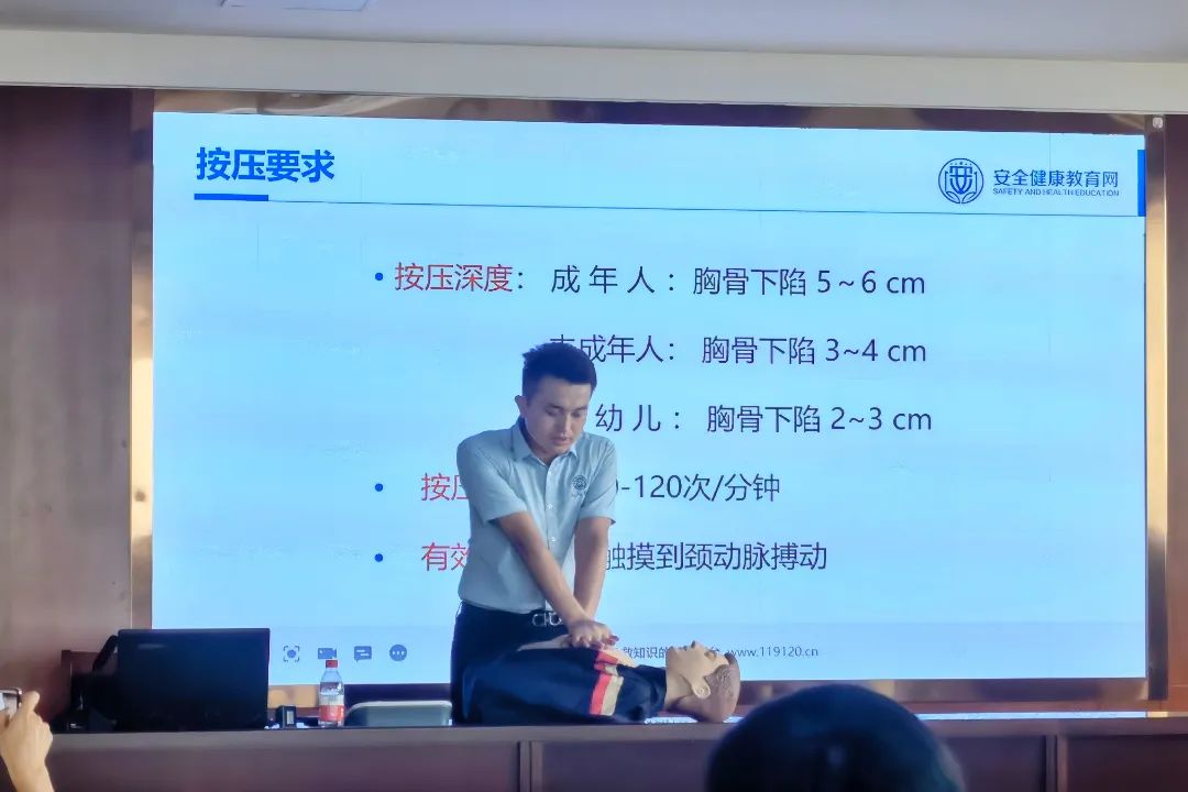 授課期間,健康教育專家通過課件的形式圍繞著職業(yè)健康知識普及如何實施職業(yè)健康保護、如何預防心腦血管疾病等方面的內(nèi)容進行了深入淺出的講解。同時,為了進一步提高培訓效果,使大家真正掌握實操的處置能力,在完成授課內(nèi)容后,又組織安排實施了心肺復蘇胸外按壓應急救護模擬練習,大家按照講解的操作流程,積極參與演練,在專家的指導下,大家操作規(guī)范,方法得當,模擬練習取得圓滿成功。