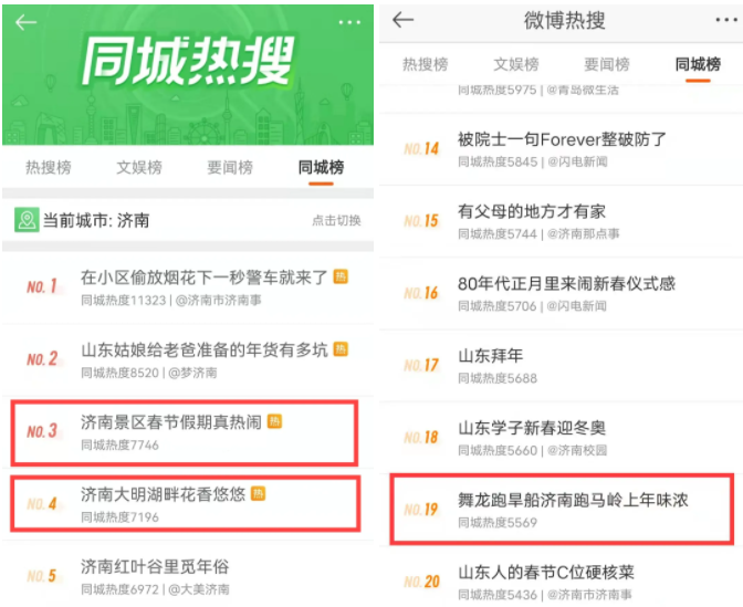 此外,春節(jié)假期期間,集團(tuán)推出的#留在濟(jì)南歡樂過年#、#大明湖畔花香悠悠#、#舞龍跑旱船濟(jì)南跑馬嶺上年味濃#、#濟(jì)南景區(qū)春節(jié)假期真熱鬧#等微博話題登錄同城話題熱搜榜,話題閱讀總量超過500萬,話題活動(dòng)廣受網(wǎng)友參與關(guān)注。