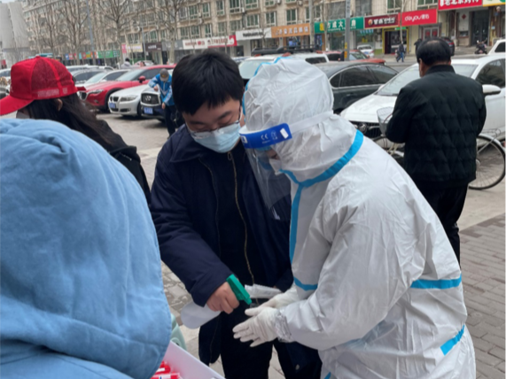 在小區(qū)日常核酸檢測現(xiàn)場,郭子琨一刻不停地配合社區(qū)工作人員進(jìn)行秩序維護(hù),一會提醒居民注意保持安全距離,一會又去協(xié)助居民進(jìn)行掃碼登記、幫助醫(yī)護(hù)人員消毒,有效地保障了核酸檢測工作的有序進(jìn)行。