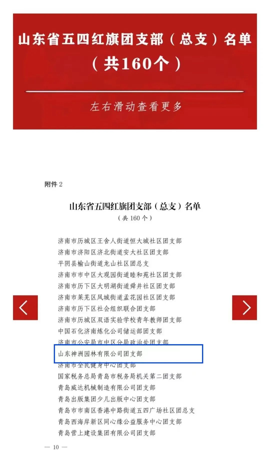 近日,共青團(tuán)山東省委公布了《關(guān)于表彰2021-2022年度“山東青年五四先進(jìn)集體”“山東青年五四先進(jìn)個(gè)人”的決定》,山東神洲園林有限公司團(tuán)支部榮獲“山東省五四紅旗團(tuán)支部”榮譽(yù)稱號(hào)。