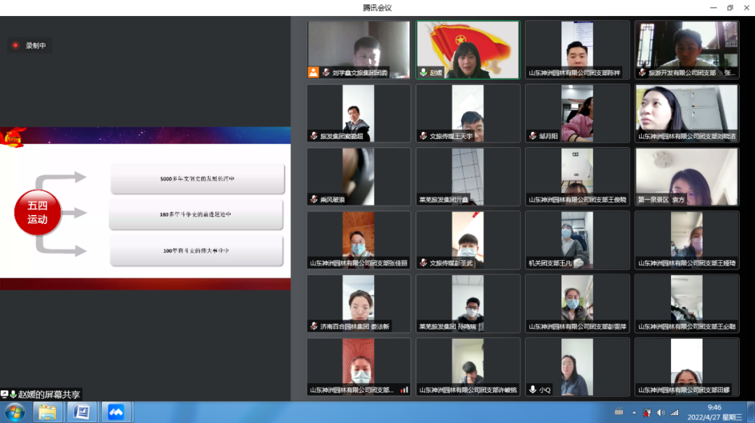 集團(tuán)團(tuán)委聯(lián)合濟(jì)南市團(tuán)校共同舉辦“砥礪奮進(jìn)守初心 青春獻(xiàn)禮二十大”團(tuán)員教育“八個一”系列活動第一場線上培訓(xùn),文旅集團(tuán)團(tuán)員干部及團(tuán)員青年共計(jì)136人通過線上或線下學(xué)習(xí)等形式參加了此次培訓(xùn),此次錄播課程將以支部為單位分7批次推廣學(xué)習(xí),計(jì)劃培訓(xùn)集團(tuán)團(tuán)員青年200余人次。“五四”青年節(jié)期間,組織團(tuán)員青年開展“青年大學(xué)習(xí)”第11期“爭做改革開放的‘弄潮兒’”線上課程學(xué)習(xí),團(tuán)結(jié)帶領(lǐng)集團(tuán)廣大團(tuán)員青年堅(jiān)定跟黨走、建功新征程。