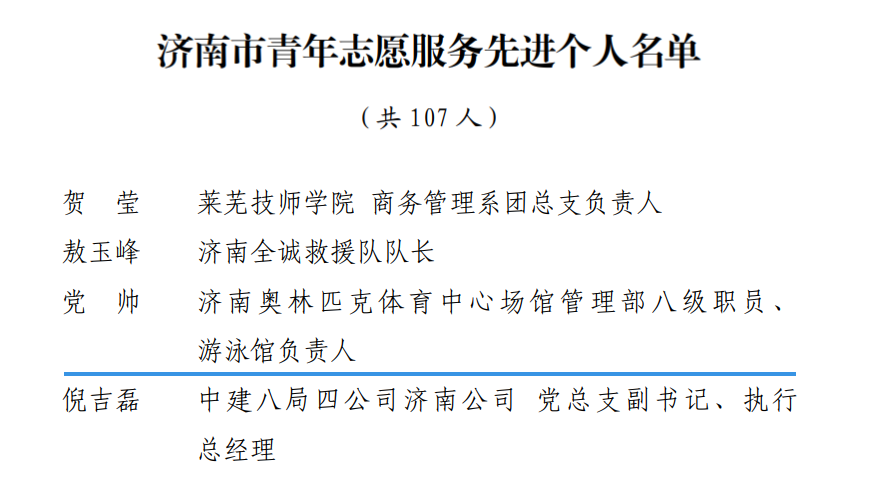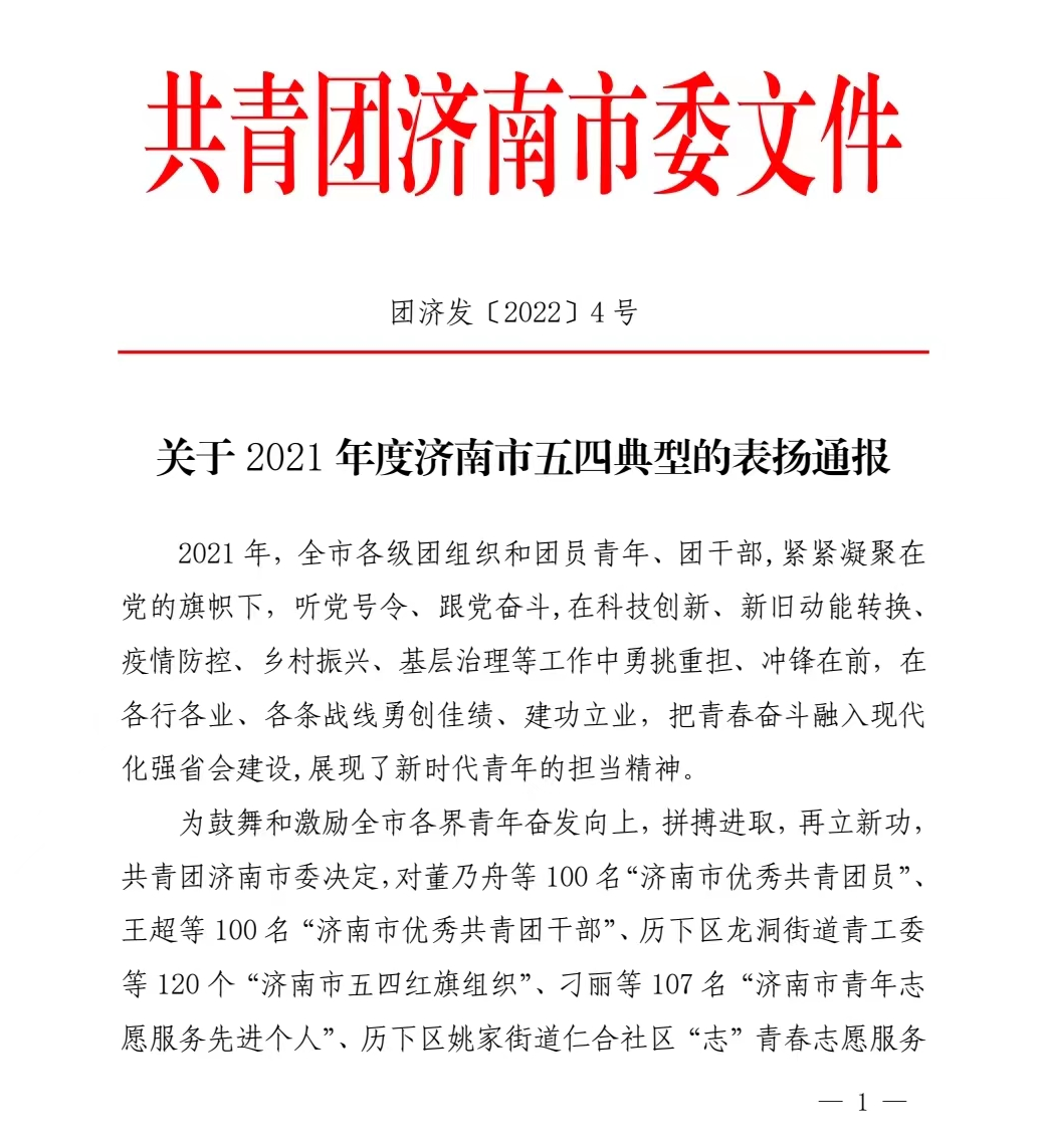 近日,共青團(tuán)濟(jì)南市委公布了《關(guān)于2021年度濟(jì)南市五四出彩典型的表揚(yáng)通報(bào)》,集團(tuán)團(tuán)委所屬團(tuán)組織及團(tuán)員青年榮獲“濟(jì)南市五四紅旗團(tuán)組織”“濟(jì)南市青年志愿服務(wù)先進(jìn)集體”“濟(jì)南市青年志愿服務(wù)先進(jìn)個(gè)人”“濟(jì)南市優(yōu)秀共青團(tuán)員”“濟(jì)南市優(yōu)秀共青團(tuán)干部”等5項(xiàng)榮譽(yù)稱號(hào)。