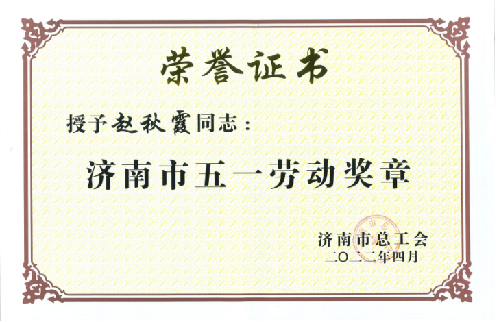旅開(kāi)公司趙秋霞同志榮獲濟(jì)南市五一勞動(dòng)獎(jiǎng)?wù)?/p>