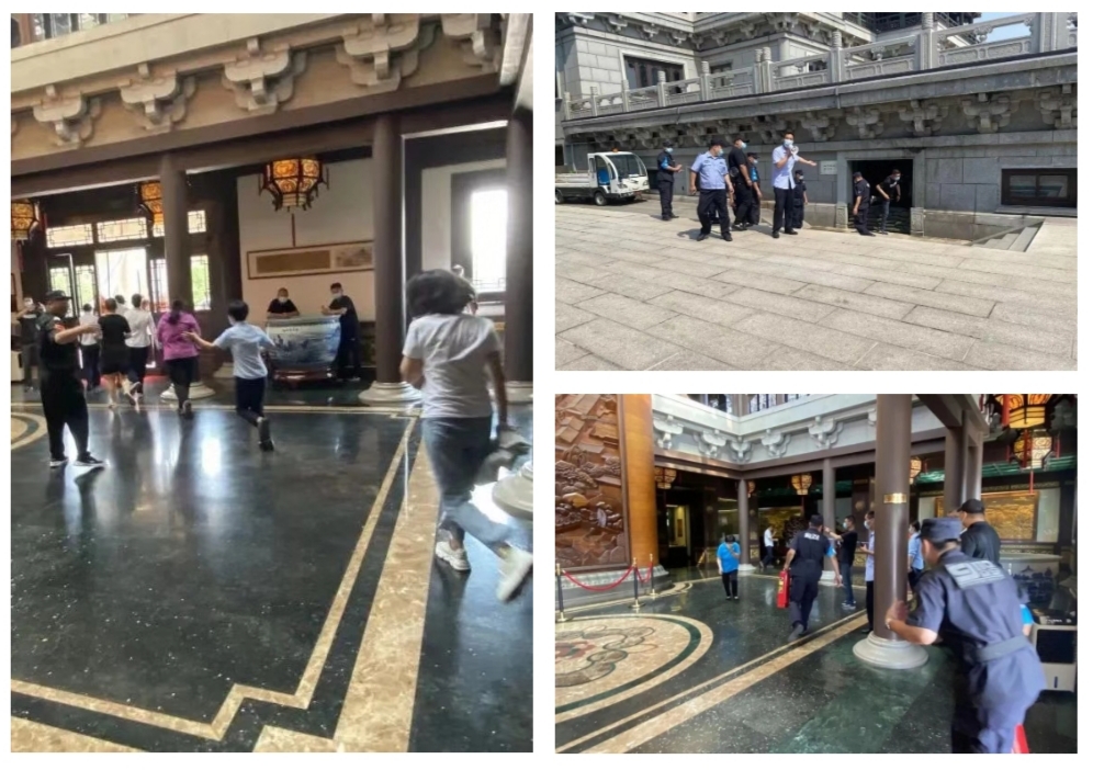 超然樓消防應(yīng)急疏散演練從實(shí)戰(zhàn)出發(fā),由超然樓班組長(zhǎng)邢娟按照應(yīng)急預(yù)案組織班組人員(物業(yè)人員)處置控制火情、疏散游客,安??坡?tīng)令而動(dòng)、火速增援,撲滅火情、警戒現(xiàn)場(chǎng)。整個(gè)演練過(guò)程清晰順暢、措施完善、處置得當(dāng)。