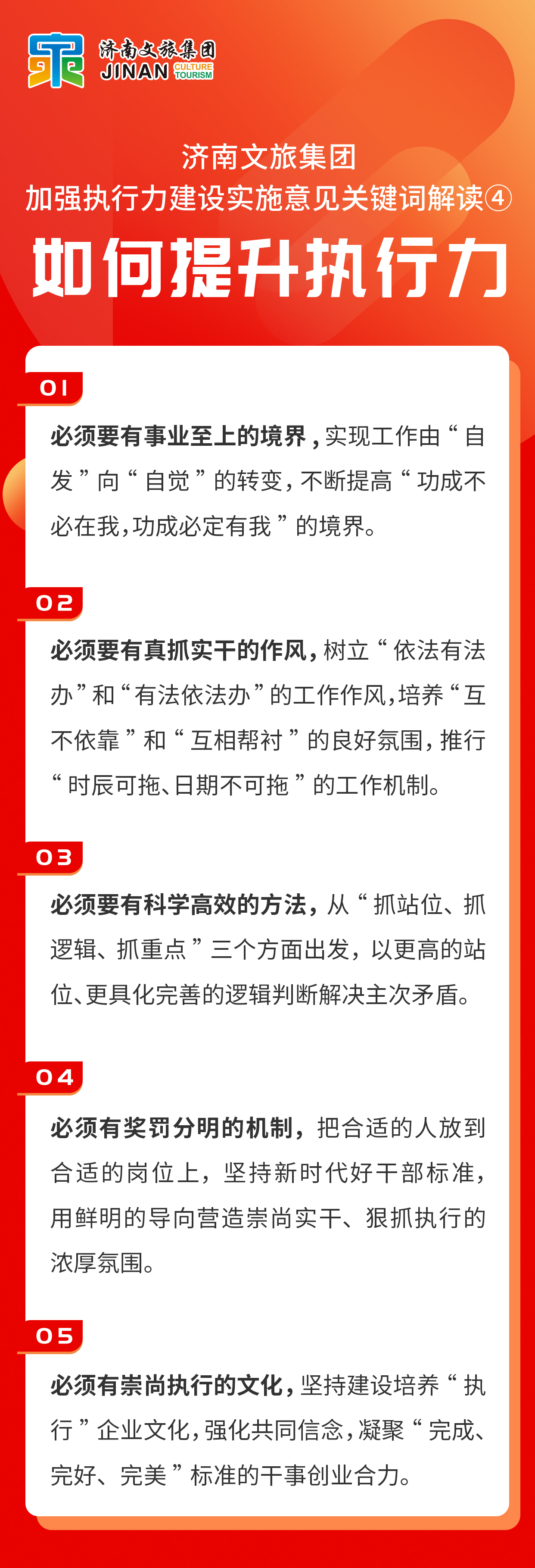 濟南文旅集團印發(fā)《關于加強執(zhí)行力建設的實施意見》(以下簡稱《意見》),進一步提升工作效能,確保集團政令暢通、令行禁止,強力推動各項決策部署高質(zhì)高效、從快從優(yōu)落實,加快打造“國際知名、國內(nèi)一流的活力文旅”,今天就如何提升執(zhí)行力進行解讀。