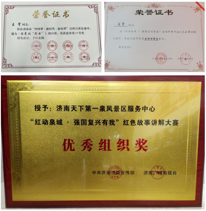 近日,王霄又在濟(jì)南市委宣傳部主辦、濟(jì)南廣播電視臺(tái)承辦的“紅動(dòng)泉城·強(qiáng)國(guó)復(fù)興有我”紅色故事講解大賽中再次榮獲“金牌講解員”稱(chēng)號(hào),天下第一泉風(fēng)景區(qū)榮獲大賽優(yōu)秀組織獎(jiǎng)。賽后,王霄隨百姓巡回宣講一同走進(jìn)市稅務(wù)局和濟(jì)南高新區(qū)開(kāi)展宣講活動(dòng)。