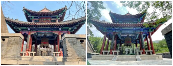 北水門區(qū)域:該區(qū)域主要問(wèn)題是匯波橋鐵質(zhì)欄桿與周邊景觀風(fēng)貌不符、匯波樓城墻風(fēng)化損壞、部分廣場(chǎng)鋪裝破損、匯波樓北側(cè)缺少道路聯(lián)通等。此次項(xiàng)目提升更換了匯波橋石質(zhì)護(hù)欄,修復(fù)了風(fēng)化損壞的城墻,更換了廣場(chǎng)地面鋪裝,對(duì)匯波樓北側(cè)游路進(jìn)行了貫通改造,增加桁架橋,沿北護(hù)城河游線全線貫通,為游客開辟了新的游覽區(qū)域和游覽線路。