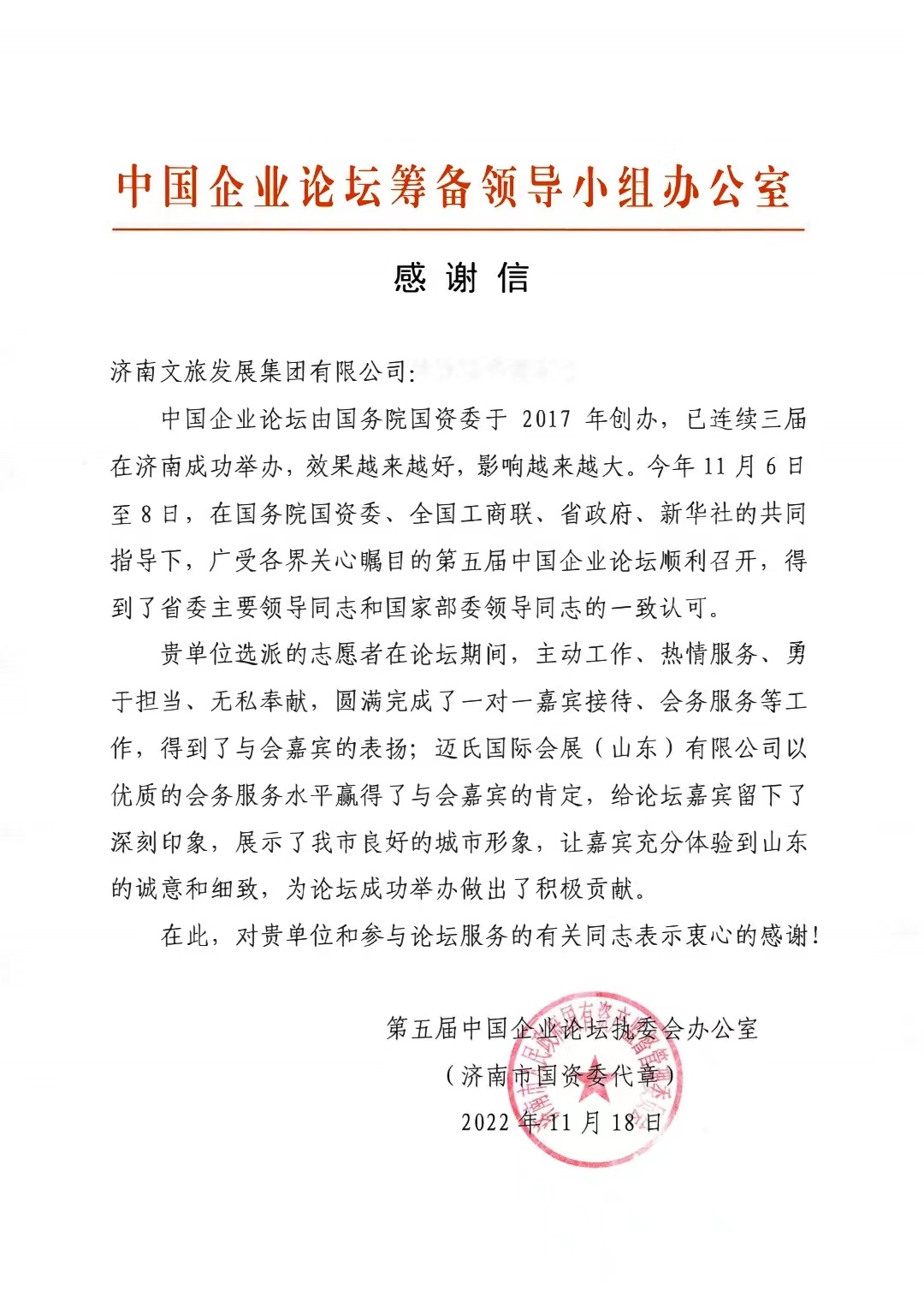 濟(jì)南文旅集團(tuán)選派的志愿者在論壇期間優(yōu)秀的工作能力獲得與會(huì)嘉賓的贊揚(yáng),集團(tuán)旗下邁氏國(guó)際會(huì)展(山東)有限公司優(yōu)質(zhì)的會(huì)務(wù)服務(wù)水平贏得與會(huì)嘉賓的肯定。第五屆中國(guó)企業(yè)論壇執(zhí)委會(huì)特此發(fā)來(lái)感謝信,全文如下: