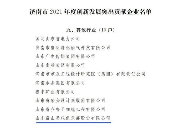 日前,《濟(jì)南市人民政府關(guān)于表?yè)P(yáng)2021年度創(chuàng)新發(fā)展突出貢獻(xiàn)企業(yè)的通報(bào)》發(fā)布,山東泰山足球俱樂(lè)部股份有限公司榜上有名。