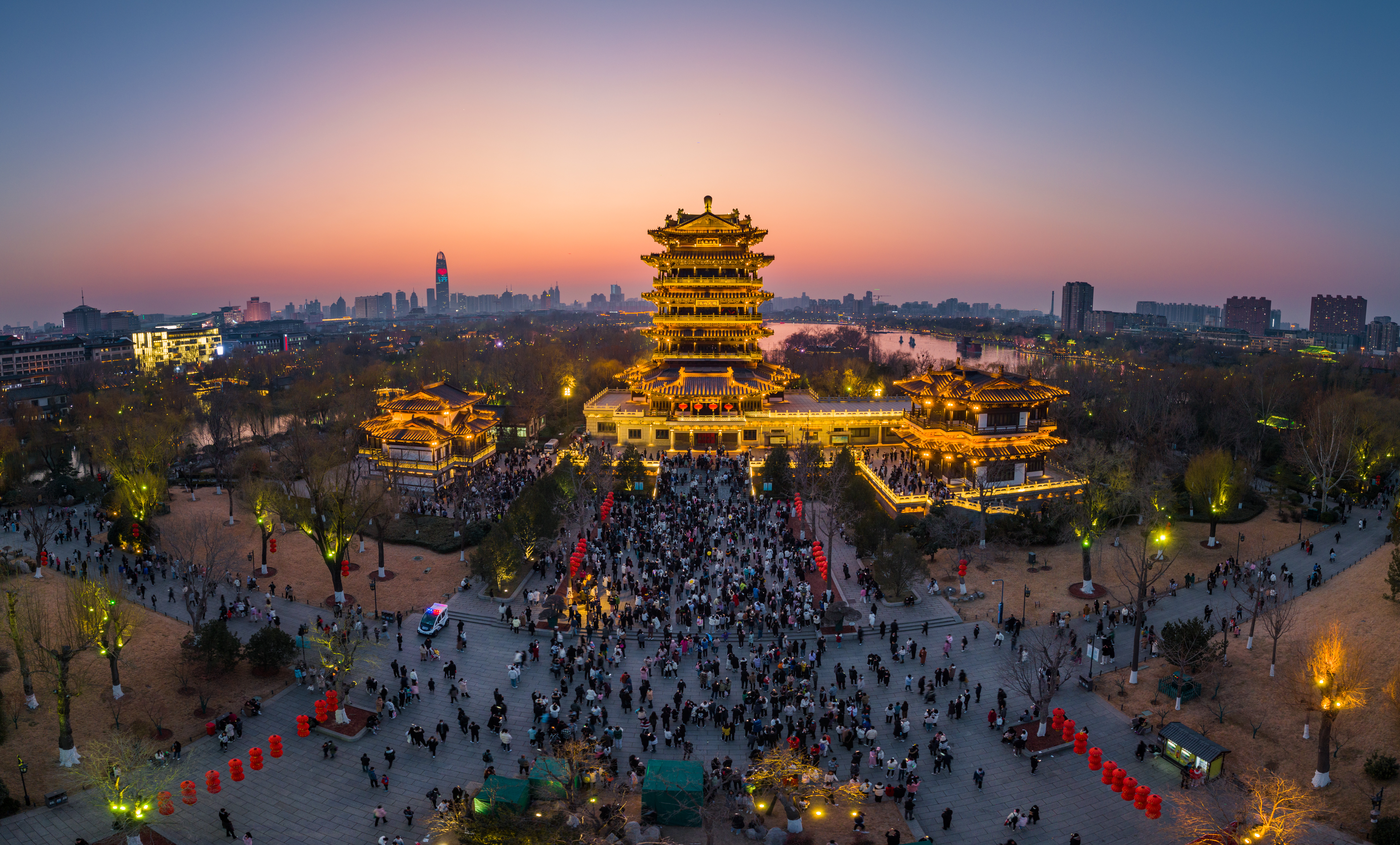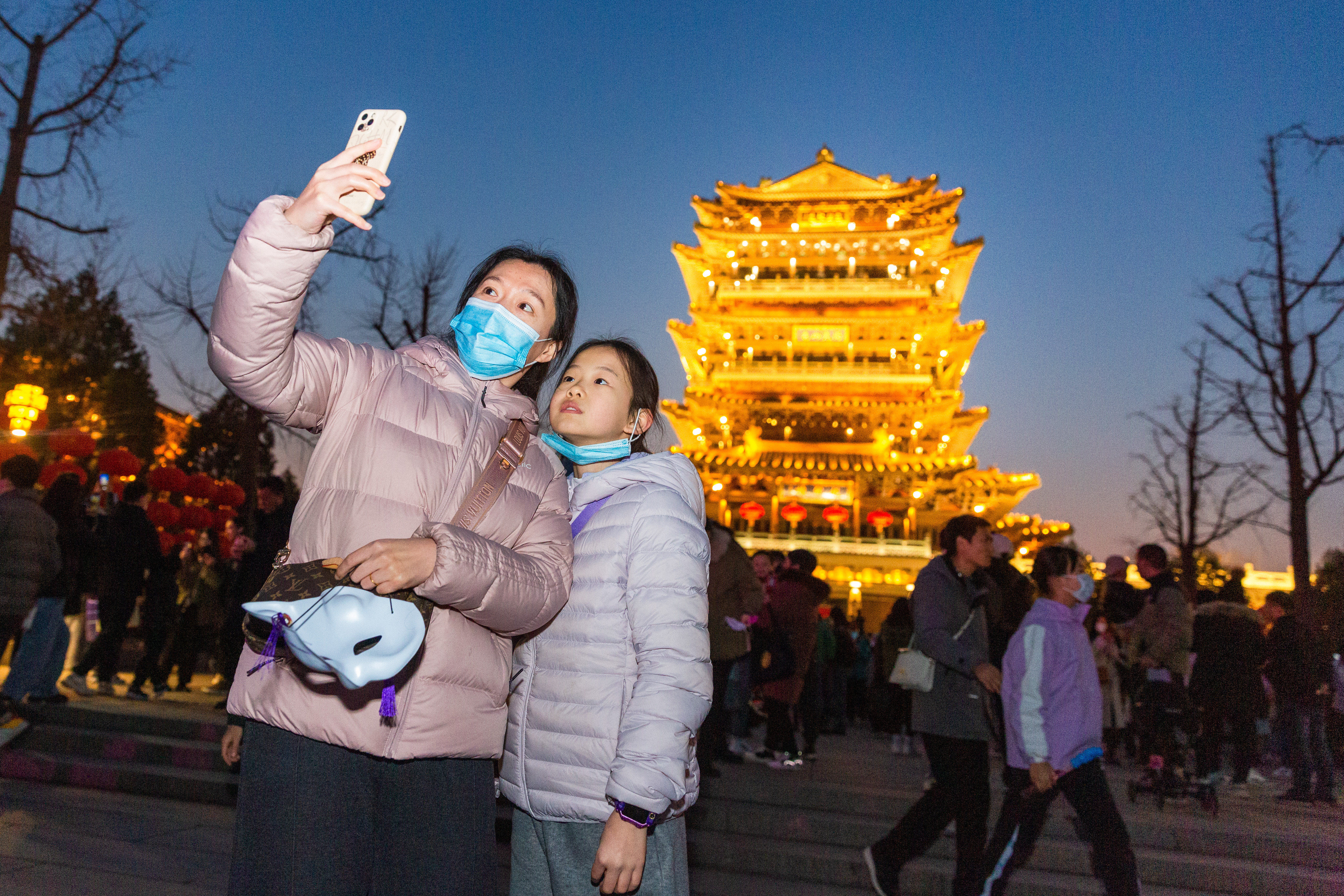 超然樓亮燈被追捧的人群拉滿了儀式感:人群里的手機對準了即將亮燈的樓體,傍晚的廣場像被手機屏幕的光亮排成的矩陣,大有熱播電視劇《三體》里人體陣列計算機的感覺。當時間如約而至,樓體依次披滿黃光,繼而斗拱處燈盞閃亮,從燈光勾勒的檐角分明,到瞬間通體金碧輝煌。在一片“哇”的驚呼聲中,超然樓被點亮了。
