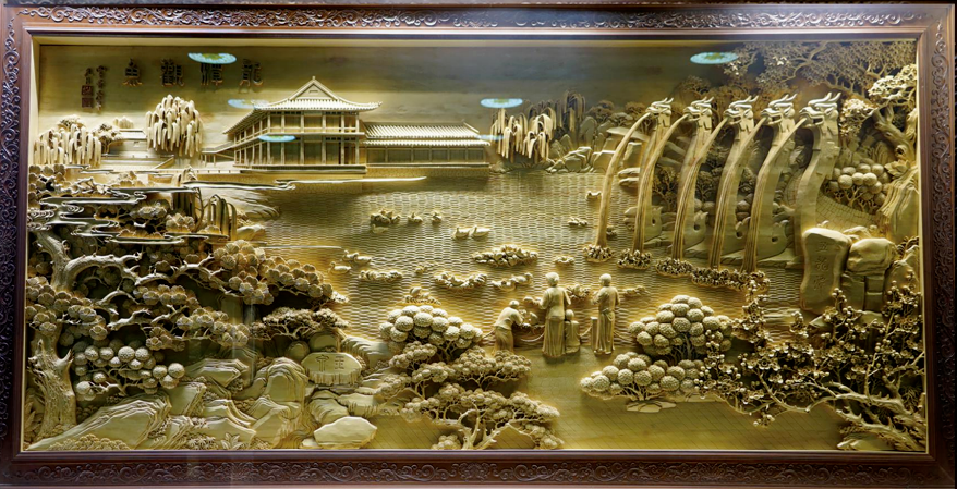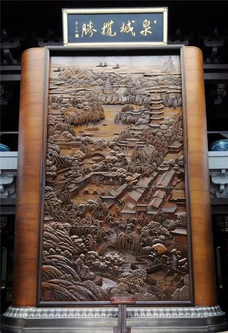 一進門,抬望眼,高堂正中間是一幅木雕巨制,名曰《泉城攬勝》。作品高8米,寬4.9米,由楠木雕刻而成,邊框用的是紅花梨,表面涂亞光漆。作品采用鏤空雕、深浮雕、淺浮雕、立體雕(人物)等傳統(tǒng)工藝手法,質(zhì)樸渾厚,層次豐富,色澤淡雅。作品規(guī)格之大,雕刻工藝之高,在國內(nèi)屈指可數(shù)。