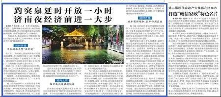 2023年6月5日,《濟(jì)南日報(bào)》刊發(fā)題為《趵突泉延時(shí)開放一小時(shí) 濟(jì)南夜經(jīng)濟(jì)前進(jìn)一大步》的文章,采寫記者為劉燁。文章寫到,調(diào)整趵突泉公園的夜間開放時(shí)間,濟(jì)南文旅集團(tuán)和天下第一泉風(fēng)景區(qū)服務(wù)中心更多基于公益角度出發(fā),希望發(fā)揮城市核心景區(qū)的表率帶頭作用,為城市夜經(jīng)濟(jì)增加載體,營造高品質(zhì)夜間文旅消費(fèi)環(huán)境,滿足人民對美好生活的文化需要,進(jìn)一步促進(jìn)夜經(jīng)濟(jì)繁榮發(fā)展。如下為稿件詳情——