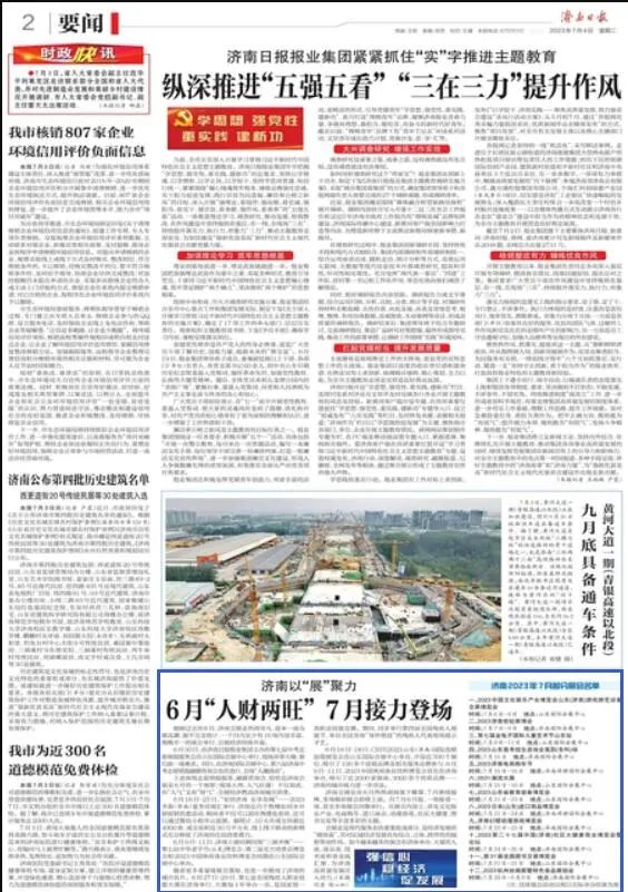 2023年7月4日,《濟(jì)南日?qǐng)?bào)》A02版刊發(fā)題為《濟(jì)南以“展”聚力 6月“人財(cái)兩旺” 7月接力登場(chǎng)》的文章,采寫(xiě)記者為陳心如。文章寫(xiě)到,剛剛過(guò)去的6月,濟(jì)南會(huì)展業(yè)熱鬧非凡,迎來(lái)一波辦展高潮,據(jù)不完全統(tǒng)計(jì),一個(gè)月內(nèi)至少有16場(chǎng)內(nèi)容豐富、規(guī)格不一的展會(huì)舉行,會(huì)展經(jīng)濟(jì)持續(xù)升溫。如今越來(lái)越多的展會(huì)在濟(jì)南舉辦,大量的人流、商品流、技術(shù)流和資金流匯聚,為濟(jì)南高質(zhì)量發(fā)展注入動(dòng)力。如下為稿件詳情——