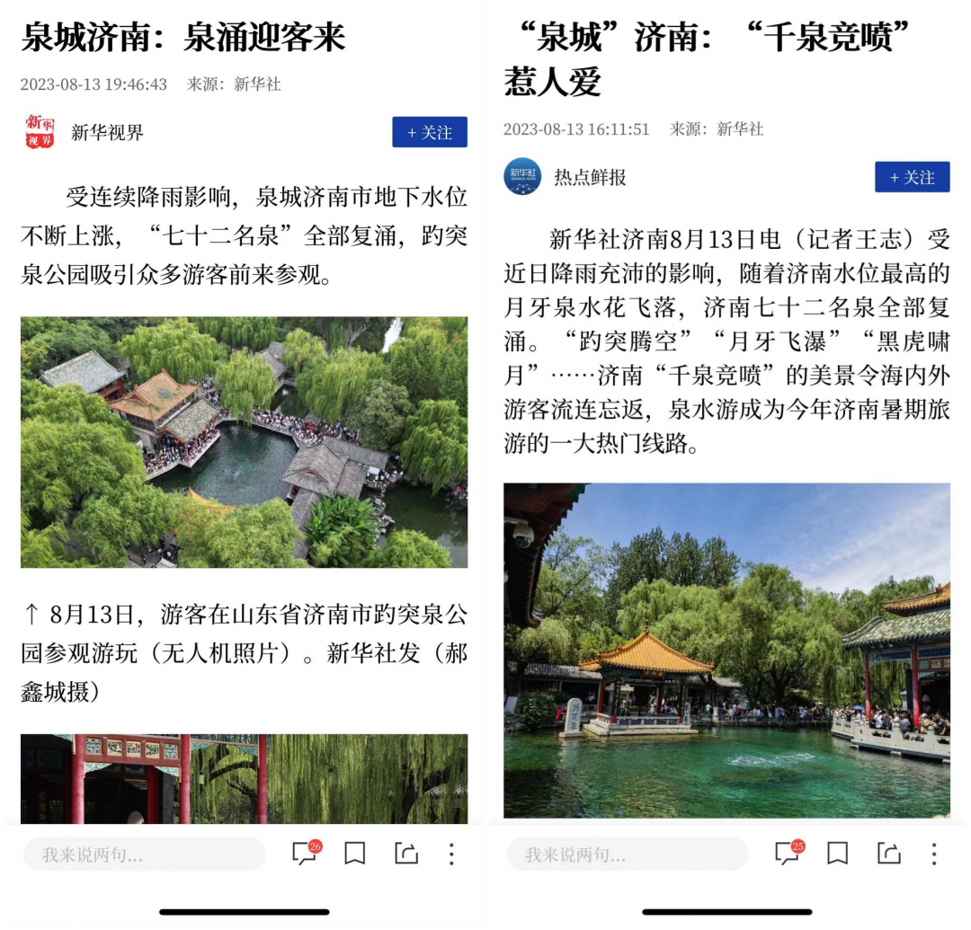2023年8月13日,新華社連發(fā)兩稿《泉城濟南:泉涌迎客來》《“泉城”濟南:“千泉競噴”惹人愛》,著重報道天下第一泉風景區(qū),點贊“泉城”濟南。文章寫到,濟南“千泉競噴”的美景令海內(nèi)外游客流連忘返,泉水游成為今年濟南暑期旅游的一大熱門線路。如下為稿件詳情——