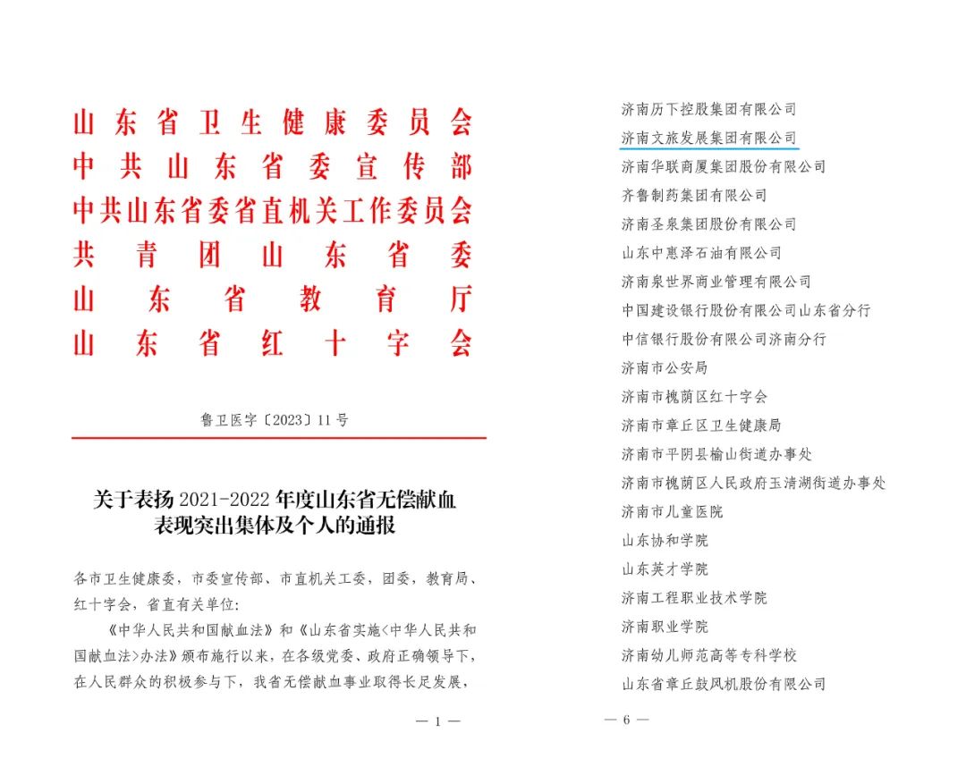 近日,山東省衛(wèi)生健康委員會、山東省委宣傳部、山東省委省直機關(guān)工作委員會、共青團山東省委、山東省教育廳、山東省紅十字會六部委聯(lián)合發(fā)文《關(guān)于表揚2021-2022年度山東省無償獻血表現(xiàn)突出集體及個人的通報》,濟南文旅集團獲“山東省無償獻血組織表現(xiàn)突出單位”榮譽稱號。