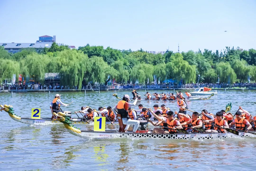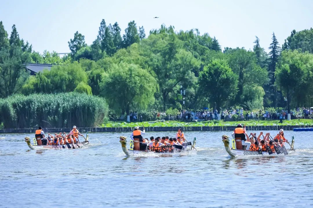 隨著發(fā)令槍響,比賽開始。比賽現(xiàn)場(chǎng)氛圍火熱,選手揮槳逐浪,龍舟破水飛馳,觀眾加油吶喊聲與龍舟鼓點(diǎn)交織響徹明湖兩岸。