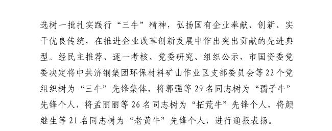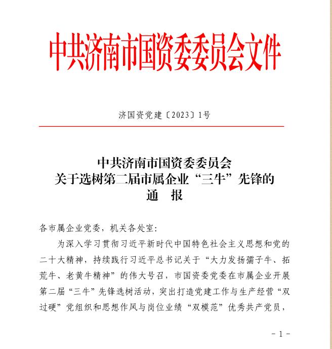 近日,市國資委發(fā)布《關(guān)于選樹第二屆市屬企業(yè)“三牛”先鋒的通報(bào)》。濟(jì)南文旅集團(tuán)馬國康同志為“孺子牛”先鋒個(gè)人,楊學(xué)惠同志為“拓荒牛”先鋒個(gè)人,李迎同志為“老黃牛”先鋒個(gè)人,進(jìn)行通報(bào)表揚(yáng)。