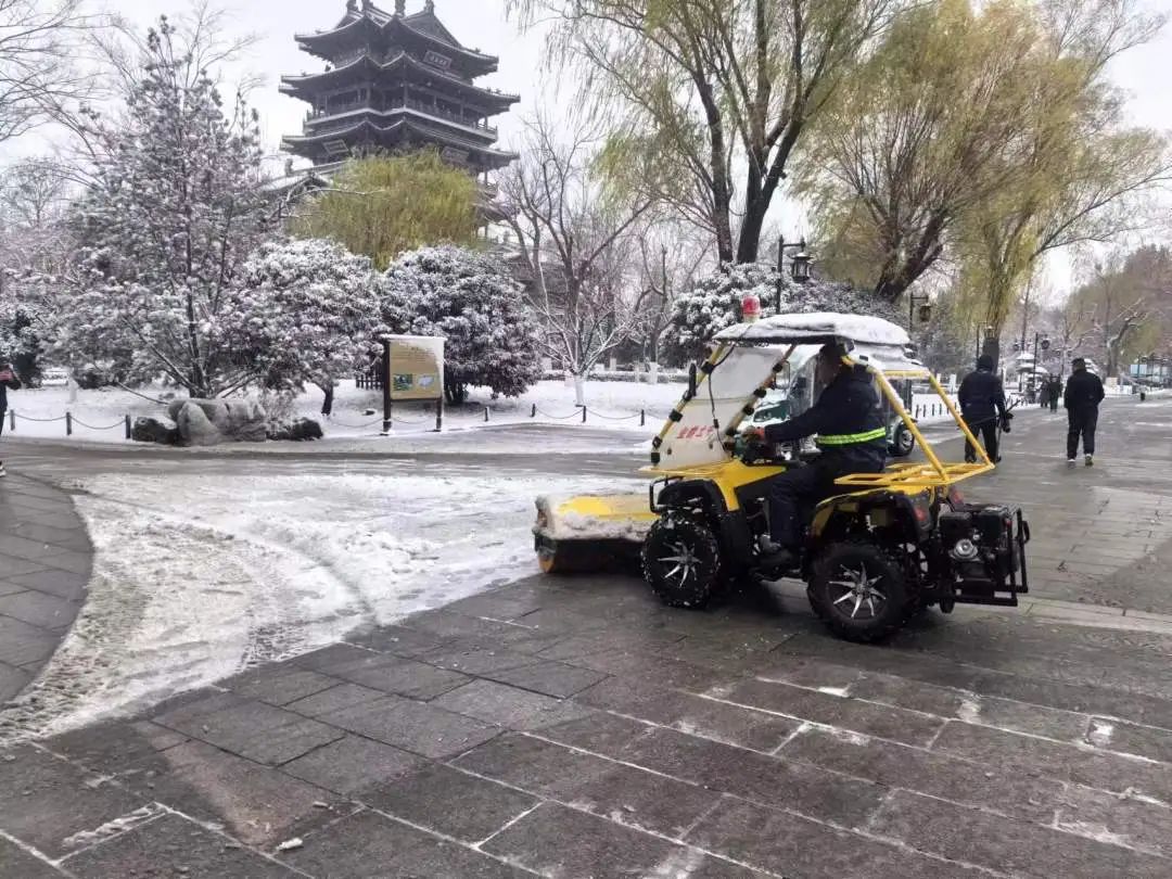天下第一泉景區(qū)接到雪情預(yù)報后,啟動應(yīng)急預(yù)案,夜間預(yù)留掃雪人員50余人,第一時間在園區(qū)各橋梁、出入口等處鋪設(shè)防滑材料,擺放防滑提示,設(shè)置語音提示。掃雪采取機械掃雪和人工清雪相結(jié)合,共投入人工200余人次,投放掃雪車2臺、改裝叉車1臺、灑水車1臺清理主干道積雪,人工清理廣場、橋頭積雪,使用竹桿等清理樹上積雪,真正做到雪停路清。
