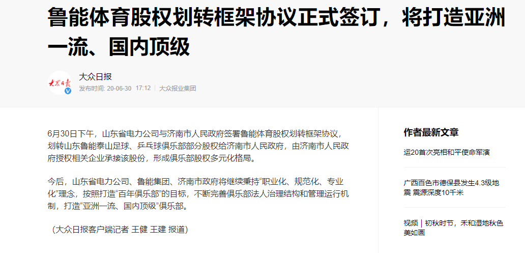 6月30日下午,山東省電力公司與濟南市人民政府簽署魯能體育股權(quán)劃轉(zhuǎn)框架協(xié)議,劃轉(zhuǎn)山東魯能泰山足球、乒乓球俱樂部部分股權(quán)給濟南市人民政府,由濟南市人民政府授權(quán)相關(guān)企業(yè)承接該股份,形成俱樂部股權(quán)多元化格局。今后,山東省電力公司、魯能集團、濟南市政府將繼續(xù)秉持“職業(yè)化、規(guī)范化、專業(yè)化”理念,按照打造“百年俱樂部”的目標,不斷完善俱樂部法人治理結(jié)構(gòu)和管理運行機制,打造“亞洲一流、國內(nèi)頂級”俱樂部。